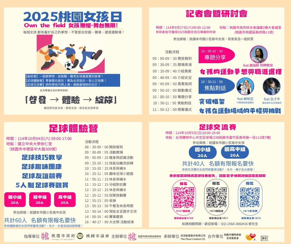 主旨: | 檢送本局「2025桃園女孩日系列活動」之電子海報及跑馬燈文字稿,請惠予協助宣傳,並鼓勵本市公私立國小、國中及高中職女孩踴躍報名,請查照。 |