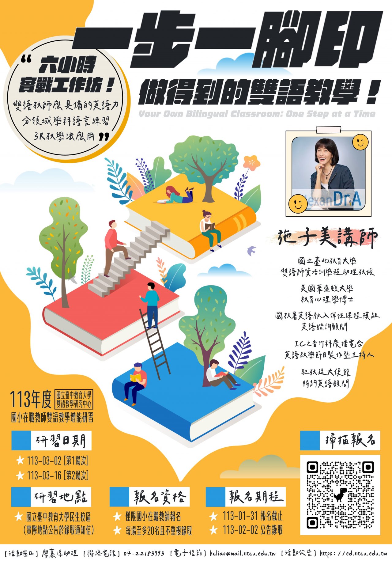 (二)研習講師:施子美博士(國立臺北教育大學雙語師資培訓學程助理教授、國教署雙語外師暨英語諮詢顧問)。